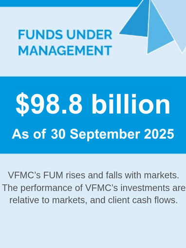 VFMC’s four Foundation clients are ESSSuper (Emergency Services Superannuation Scheme), TAC (Transport Accident Commission), VMIA (Victorian Managed Insurance Authority) and WorkSafe Victoria. These clients are required to invest in VFMC under the Victorian Government’s Centralised Investment Model (CIM).